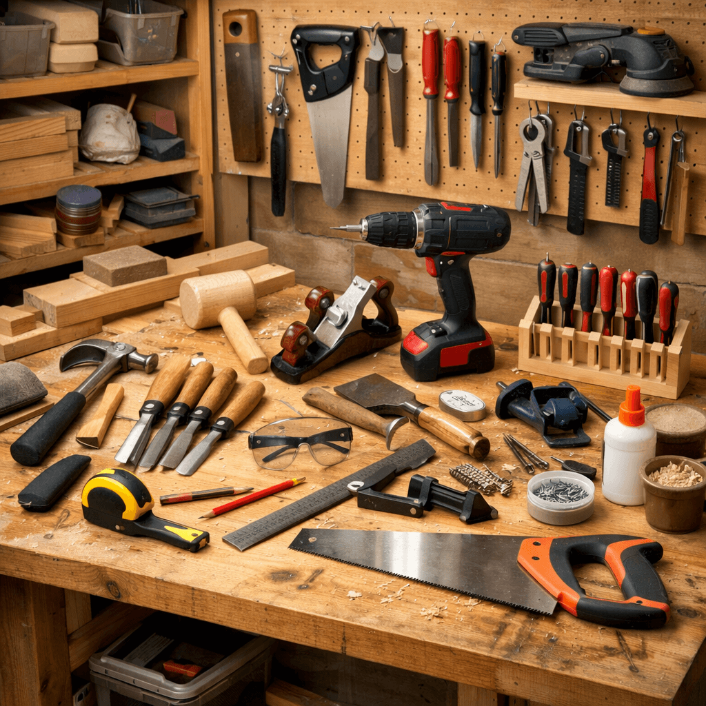 Un bon kit de mesure, des scies adaptées, des ciseaux à bois, des serre-joints et une perceuse-visseuse couvrent déjà l’essentiel.